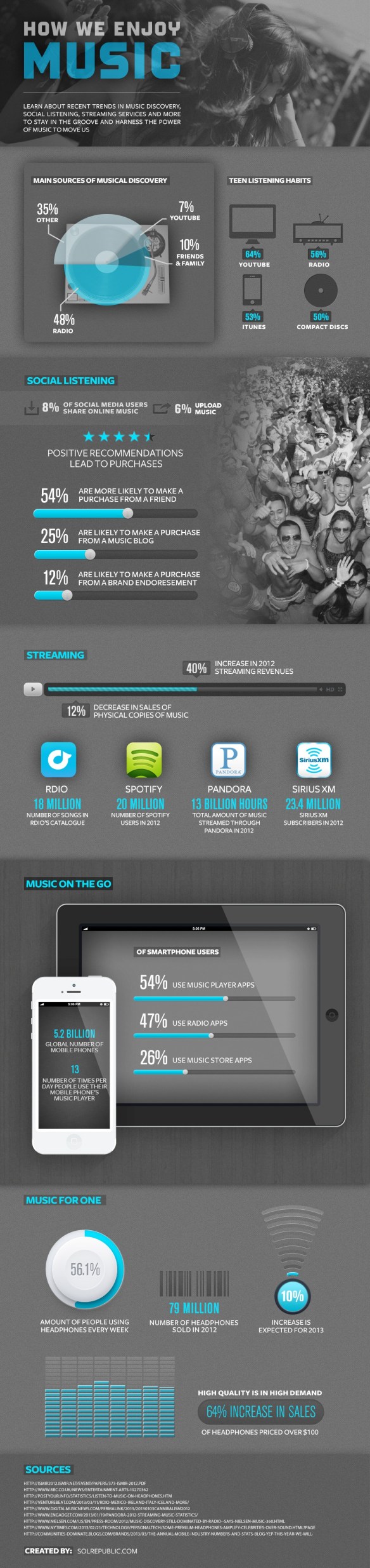 Headphone maker Sol Republic made an exclusive infographic for Mashable that breaks down some of the recent trends in music discovery, including social listening and streaming services. via How We Discover New Music Today [INFOGRAPHIC] | Mashable.