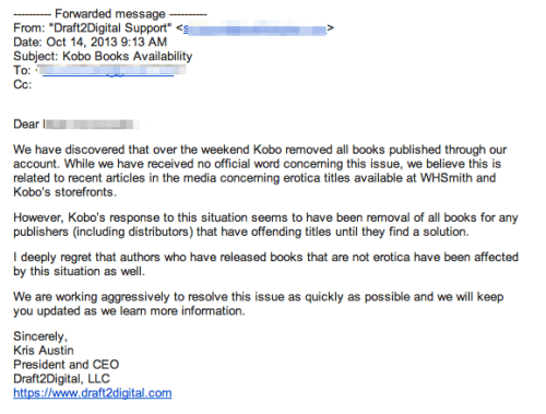 Yesterday, Kobo pulled all the content from the distributor Draft 2 Digital in response to the complaints retailers were receiving about the incest and beastiality books being self published. Authors refer to this content as Psuedo Incest because it is really about step brothers and step fathers, not blood relatives, but because Daddy PI was showing up in the children’s literature section, WH Smith went to the drastic step of shutting down its website (which is likely costing them thousands, if not hundreds of thousands of dollars a day) and Kobo pulled all the D2D content. Much of the D2D content is not “porn” but YA, sweet romance, and the like.