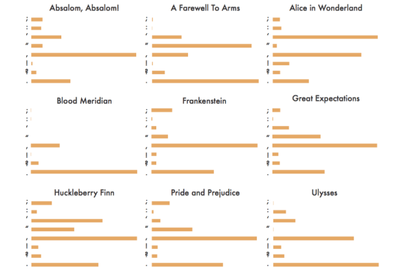 When we think of novels, of newspapers and blogs, we think of words. We easily forget the little suggestions pushed in between: the punctuation. But how can we be so cruel to such a fundamental part of writing? Inspired by a series of posters, I wondered what did my favorite books look like without words. Can you tell them apart or are they all a-mush? In fact, they can be quite distinct. READ MORE: Punctuation in novels — Medium